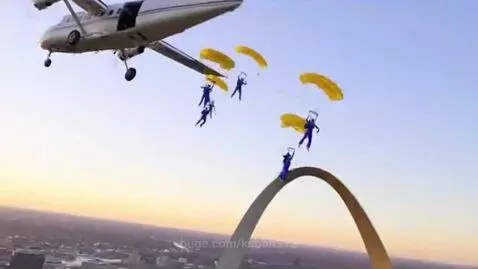 sora 2 Prompt: The scene take place over the St. Louis Arch . Five women parachute out of a small airplane. Wearing parachute gear in royal blue jumpsuits and the parachutes are yellow. They land on the ground quickly. The women stand up holding large signs saying believe in your dreams. This is realistic scene with great emotions . There is a large beautiful outside stage with a crystal chandelier hanging from the middle of the grand stage . A band is performing a full song with great rhythm to dance. The dancer are four couples doing stepping and turning. Pop and freeze dancing with back flips ending in a split. The music is a full song about making your dreams become a reality. It has heavy drums in the music. The women are in beautiful in yellow jumpsuits with blue shoes. They have long braids , long ponytails and long curls. The women clap their hands five times and the men in blue suits with yellow shoes appear. They all dance together on the grand stage .