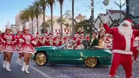 sora 2 Prompt: A holiday parade in Hollywood, Califonia for Christmas with horses and carriages, marching bands and dancing girls in fancy outfits. Drill teams dancing in matching outfits. Fancy cars with celebrities that are convertibles emerald green cars with gold rims. Trucks filled with gifts and decorated with Christmas lights flashing. Santa Claus dancing doing pop dancing with money raining down on the crowd. Reindeers dancing with white Alaskan huskies. To a song about being happy and grateful in 2025. ic of