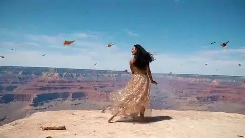 hair long dress made gold crystal doing ballet in front of the Grand Canyon. With butterflies circling around her. Saying all of dream are possible. Along with other positive affirmations.