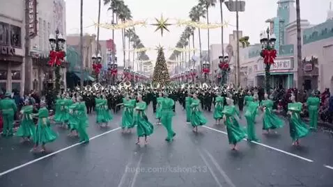 sora 2 Prompt: The scene takes place in on Sunset Blvd in Hollywood. One hundred dancers take over the streets and celebrate the holiday. In style with graceful dancing and beautiful dance costumes in the color of emerald green. With snow flakes falling from the sky on Christmas day. This a panoramic picture that shows the street view. Next is the large marching band playing a song called step into your destiny.