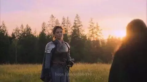 Beautiful strong warrior goes to meet woman with long black hair blowing wind fna field around forest sunrise