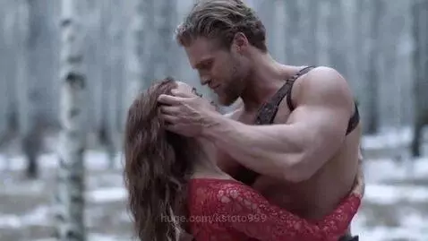 A strong, handsome, bare-chested Russian warrior tenderly embraces, caresses, and touches the hair of a woman with long hair and a red lace dress.