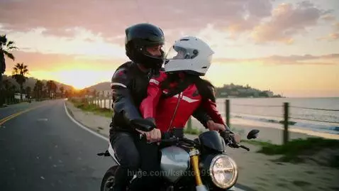 a beautiful strong man and a woman with long black hair ride on a motorcycle along the sea shore towards sunset and gently kiss