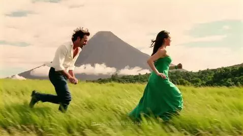 A man in an unbuttoned white shirt and a woman in a long green dress run through green grass, the wind blowing against each other against the backdrop of a volcano and a blue sky with clouds