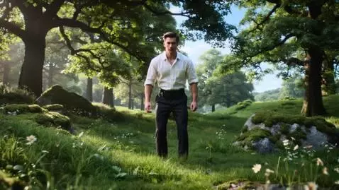 A handsome, strong man with blue eyes flips over and turns into a black cat. A beautiful, grassy forest surrounds the cat. The cat looks and walks towards the camera.