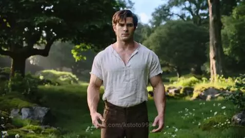 A handsome, strong man with blue eyes spins and turns into a black cat around a beautiful, grassy forest. The cat looks and walks towards the camera.