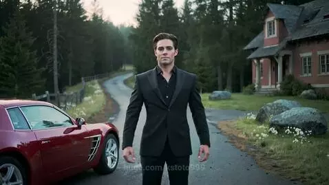 Kling 2.5 Turbo (pro) Prompt: A red luxury car on an abandoned road in the forest, an old house nearby, a handsome strong man spins and turns into a beautiful young woman with long black hair and blue eyes in a transparent long blue dress with a golden collar around her neck, she is depicted in the camera, smiling