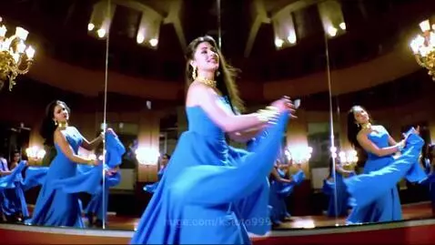 A beautiful woman dancing in a blue dress with all sorts of gold jewelry