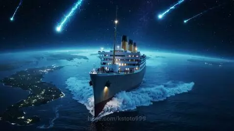 The Titanic sails through a stormy sea, surrealism, low angle, planet Earth in the background, view from orbit, shooting stars, professional photo, UltraHD