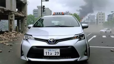 Japan Need for Speed in real life, Toyota Prius Taxi car with Taxi logo in the background of a destroyed Japanese city after an earthquake in real 3D