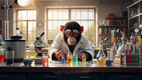Monkey scientist in the lab Monkey in a white coat and glasses is experimenting with multicolored reagents, where every vial smiles and the laboratory equipment comes alive.
