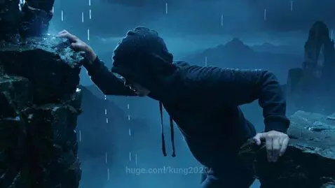 Evening, rain, a young guy in a black hoodie and a black hood, hanging over a precipice, clinging with two hands to a ledge, side view, looking up.