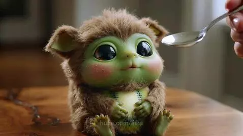 Kling 2.5 Turbo (pro) Prompt: Main Prompt: A surreal close-up shot focused on a cute, plush toy. like kiwi fruit baby sitting Bcon a textured wooden table, being fed by a human hand with a shiny silver spoon. The kiwi baby's head, limbs, and body are covered in Msoft, fluffy brown fur with fine, long fibers, while its face and central body are made of smooth, plump green kiwi flesh speckled with tiny black seeds. It has large, glossy pure black eyes and round, rosy cheeks. 5 208 1175 221 5 566 Subject: Kiwi Baby: Its face is kiwi green (not furry brown), and its cheeks are pink or red. Eyes are pure black, like two shiny black beans, not with white sclera. Posture: Sits upright with its small hands folded on its belly. Action & Expression (Frame-by-Frame Analysis): 1s: Head slightly tilted up, mouth open wide. Its round, green cheeks and large, black eyes look at the approaching spoon with J anticipation. 1-3s: The spoon enters its mouth, and its green cheeks are comically squeezed, its black eyes squint slightly, and its expression is one of contentment. 3-5s: Starts chewing, head slightly wobbling. Its eyes are squinted into thin lines, and the corners of its mouth turn up in a blissful smile. 5-7s: Mouth closes, expression returns to normal as it swallows, a look of enjoyment lingering. veo 7-9s: Opens its mouth wide again, revealing the green interior of it mouth, anticipating the next spoonful. Scene & Environment: An indoor setting with a softly blurred background, keeping the focus on the kiwi baby and the spoon. The wood grain of the table is finely detailed, Benhancing the realism. Camera Angle & Composition: A medium closeup shot centering the kiwi baby. MLighting & Color: Soft, warm natural light, casting subtle highlights on the fluff, the smooth green flesh, and the metallic spoon. The eo color palette is a harmonious bled of warm browns, vibrant greel and cute reds, creating a strong yet pleasing contrast.