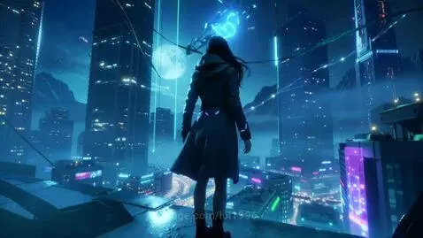 Kling 2.5 Turbo (pro) Prompt: A cinematic ultra-detailed photorealistic short scene. Cyberpunk, 2099 year. Virtual Reality. No helmet. No VR-glass. No phisical connector. Wide shot of cyberpunk city from rooftop, glowing skyscrapers pierce fog, hooded young woman stands on edge looking down, wind in her coat, neon lights dance below. Neon. Night.
