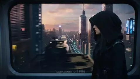 Kling 2.5 Turbo (pro) Prompt: Scene. Traveling Above the City A cinematic ultra-detailed photorealistic short scene. Cyberpunk, 2099 year. The monorail glides silently over the glowing city grid. Camera tracks alongside, showing massive towers, bridges, and holographic billboards passing below. Inside, the hooded young woman stands near the window, her reflection overlapping the skyline. Warm orange-pink sunrise light mixes with cold neon blues. 5 seconds, cinematic aerial motion, ultra-detailed reflections.