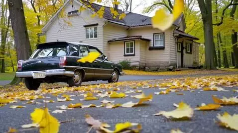A small old car parked in front of an old house. Trees stand yellow, leaves swirl, and fall on the asphalt. Wind