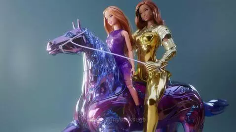 barbie riding a robot horse in the metaverse, metallic shiny wet everywhere