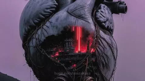 sora 2 Prompt: Violent, jerky animation style. The rusted heart beats with a sudden, aggressive spasm every two seconds, causing black oil to drip from the pipes. Inside the cloudy resin, thick black smoke billows intensely, and the red lasers strobe erratically, cutting through the scratches on the surface. The pitch-black ash on the ground falls upward into the sky. High tension, unsettling rhythm.