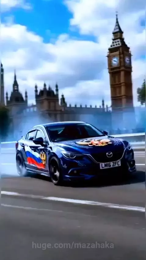 A blue Mazda 6 taking over the streets of London with pure power. From the iconic Big Ben backdrop to the double-headed eagle on the hood, this is a masterclass in urban drifting. 🏎️🇷🇺