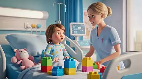 A cute small child sitting on a hospital bed, clean and bright hospital room, colorful toys beside the bed. A kind female nurse aged around 27–28 years, wearing a neat nurse uniform, smiling warmly. The child and the nurse are having a funny, innocent conversation, both laughing happily. The baby is making cute expressions while talking. The nurse is slightly bending toward the child in a friendly and caring way.