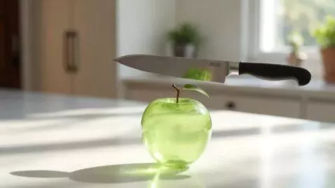 Нож нарезает стеклянное прозрачное яблоко с зелёным оттенком