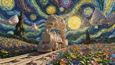 Gemini Prompt: Following the camera, element dynamics: A vintage steam train puffing fluffy cream-like white smoke slowly approaches the camera, train wheels grinding against tracks creating rhythmic "clang-clang" sounds; Van Gogh-style starry sky swirls continuously flowing, yellow sun slowly rotating and glowing; white 3D clouds gently rolling like cream, colorful flower field petals subtly trembling.