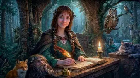 Seedance 1.5 Pro Prompt: The painting, colorful and rich, in cool tones, depicts the hour between day and dusk, when the boundaries between worlds become thinner. A storyteller, a young woman with a warm, pensive gaze and two chestnut-colored braids woven with wildflowers, sits in a carved wooden tower, but one wall seems to have dissolved into the forest—ancient spruce and birch trees have grown right into the room. On the oak table stands a manuscript, next to a candle with a lively, slightly bluish flame. The quill is not an ordinary one, but the feather of a firebird, which itself leaves golden traces of letters on the paper. On the walls are carved patterns that come to life upon closer inspection: running deer, flying swans, a swirling grassy pattern. The storyteller's clothing: a deep emerald linen dress with delicate embroidery reminiscent of forest ferns. On her shoulders is a bark-colored cape with a wooden clasp. On her belt is a light-wood flute with fine carving. Characters around: In the foreground is the Domovoy, a fairy-tale mythical character, a spirit, small, with a beard like moss, sits at her feet and listens, resting his chin on his fist. The Bayun Cat is a huge gray cat with wise eyes, but one ear is turned towards the storyteller, curled up on a chest standing in the dark right corner. In the middle ground: The Leshy peeks out from behind the trees - curious, shaggy, with mushrooms in his beard, a Mermaid with a fish tail sits on the bank of a stream that flows right through the room (the border of the worlds is blurred). A fox with a smart look sits at the storyteller's feet. The Sirin bird sits on a branch that has grown through the roof. In the background, in the semi-darkness of the forest - silhouettes of elves, a Deer frozen between the trees. Next to him, the griffin lay down in the shade of the bushes and listened attentively to the storyteller.