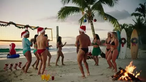 Kling 2.5 Turbo (pro) Prompt: Vibrant Christmas beach party at golden hour, diverse group of people in colorful swim ware very thin bikinis on see through summer attire and Santa hats dancing around a decorated palm tree with twinkling lights and ornaments, tropical drinks with candy cane stirrers, surfboards with Christmas wreaths, beach volleyball net with garland, inflatable Santa on a surfboard in the waves, bonfire with stockings hung nearby, everyone laughing and celebrating, cinematic camera movement sweeping across the scene, warm sunset lighting, festive tropical atmosphere, 4K quality, professional color grading
