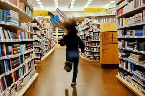 A woman running through a Barnes & Noble as book shelves fall behind her and books are thrown at her