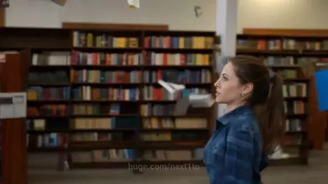 A woman running through a Barnes & Noble as book shelves fall behind her and books are thrown at her