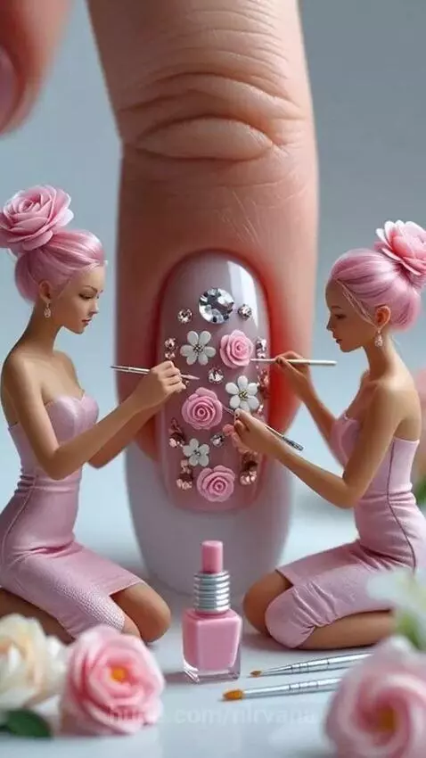 Two tiny artists carefully decorate a glossy light-pink nail. They add small rose shapes, simple floral elements, and shiny decorative details using miniature tools.