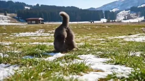 Blue Shorthair Cat Plays in Snow