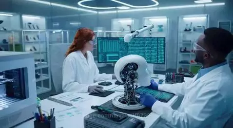 Two scientists in a lab ate creating an AI robot. Their computer screens and the head of the robot are visible. They wear white lab costs and speak about the project.