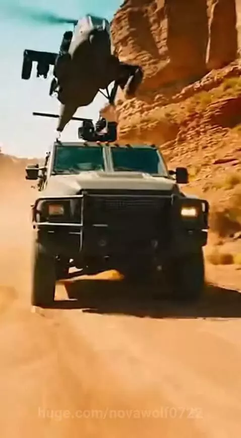 Sora Prompt: Michael Bay–style high-speed armored truck escape through desert canyon; helicopter blades roaring above, dust explosions, camera switching between wide aerial shots and in-cabin shaky close-ups. Missed rockets slamming into the canyon wall, debris showering the lens. Sharp turns, metal grinding, heavy kinetic force. Pure adrenaline pacing, Dolby Vision look.