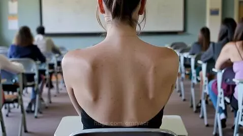 Anya is sitting in the classroom in a Raserback top. Bare back, rear view.