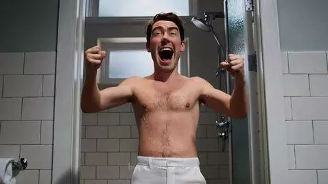 a man is smiming in his flooded bathroom when 100 kermits brake in screaming and dancing