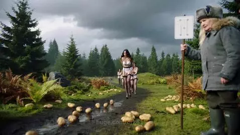 Kling 2.5 Turbo (pro) Prompt: Belarus. Autumn. Rain. A pine forest. Overcast. Leaden clouds. In the middle of the forest, a sunlit clearing. The clearing is covered in moss and ferns. And a lot of mud. Also, potatoes are scattered all over the ground. Moving from the center to the left and simultaneously towards the camera are beautiful young women. The women are dressed in luxurious lace undergarments, with stockings attached to a narrow garter belt, lace bras, and high-heeled shoes on their feet. They are dragging a dirty, heavy ship's chain with large links behind them; at its end is an anchor – the anchor is half-buried in the ground, so the chain is pulled taut. In the right corner of the clearing stands a group of spiteful older women. The spiteful women are dressed in grimy winter jackets, tarpaulin boots on their feet, and winter trapper hats on their heads. Their faces are grim and unsmiling. The spiteful women hold signs mounted on sticks. The signs depict a radio circuit diagram with transistors and diodes. The spiteful women glare spitefully. The camera looks up from a low angle! A woman should be free to express her desires, whatever they may be. Don't be a prude. Do it brightly and with taste. Remember that entropy in the universe is increasing, and we have no time for restrictions and prohibitions in depicting beauty and elegance. photorealistic, incredibly detailed, dramatic