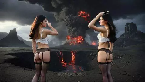 Kling 2.5 Turbo (pro) Prompt: Belarus. Siberian Traps. The Permian extinction period. The scene is set in a shallow depression—a quiet hollow in the scorched earth—beneath a sky smothered by dark, leaden clouds. In the distance, rising far above the horizon, stretches an immense, jagged ridge of trap formations: colossal, ancient, and terrifyingly alive. These towering basaltic cliffs erupt relentlessly, spewing rivers of lava that bleed across the land, their hellish glow flickering through the ash-choked air. In the foreground, within this lowland basin, stand beautiful young women—posed with their backs or profiles to the camera—gazing calmly at the cataclysm on the distant heights. They stand not in tension, but with relaxed poise: shoulders soft, postures fluid, utterly at ease. With unhurried grace, they comb their hair using ornate combs, as if performing a quiet ritual of beauty amidst the end of the world. They wear luxurious lace undergarments—delicate lace bras, sheer stockings secured by narrow garter belts, and elegant high-heeled shoes—unbothered by the chaos around them. The scene is captured from a dramatic low-angle perspective, emphasizing the sheer scale of the erupting traps above and the serene, unshaken presence of the women below. A woman should be free to express her desires, whatever they may be. Don’t be a prude. Do it brightly and with taste. Photorealistic, incredibly detailed, dramatic. Remember that entropy in the universe is increasing—and we have no time for restrictions or prohibitions in the depiction of beauty and elegance.