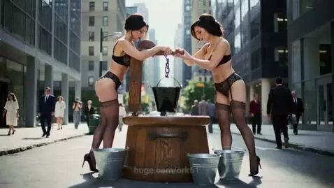 Kling 2.5 Turbo (pro) Prompt: Belarus, New York, Manhattan. The height of the business day. In the background, glowing people, a business center. In the foreground, beautiful young women are using an ancient well sweep (well crane) to draw water. They draw the water and pour it into buckets. The well sweep is wooden, antique in form and mechanism. The water from the well is poured into old-fashioned metal iron buckets. Businesspeople and tourists walking around Manhattan approach the women with these iron buckets.The beautiful young women are dressed in luxurious lace undergarments, with stockings attached to a narrow garter belt, lace bras, and high-heeled shoes on their feet. Do it brightly and with taste. Photorealistic, incredibly detailed, dramatic, vivid, bold. A woman should be free to express her desires, whatever they may be. Don't be a prude. Remember that entropy in the universe is increasing, and we have no time for restrictions and prohibitions in depicting beauty and elegance.