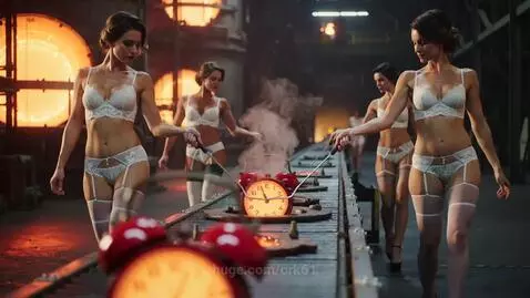 Kling 2.5 Turbo (pro) Prompt: Belarus. South Korea, Pohang, North Gyeongsang Province. POSCO Pohang Steel Plant, continuous casting shop — interior. In the background, furnaces filled with molten metal are visible. A conveyor belt runs from the furnace toward the camera, carrying finished products—alarm clocks and anchors. The clocks are still glowing red-hot; steam rises from them, and small droplets of molten metal drip off. On both sides of the conveyor belt stand beautiful young women, using long metal hooks to flip the clocks and anchors as they move along the line. The beautiful young women are dressed in luxurious lace undergarments, with stockings attached to a narrow garter belt, lace bras, and high-heeled shoes on their feet . Do it brightly and with taste. Photorealistic, incredibly detailed, dramatic, vivid, bold. Photorealistic, ultra-detailed, cinematic 8K, golden-hour lighting, dramatic contrast. A woman should be free to express her desires, whatever they may be. Don't be a prude. Remember that entropy in the universe is increasing, and we have no time for restrictions and prohibitions in depicting beauty and elegance.