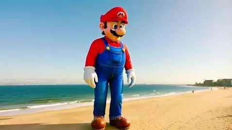 Giant Mario Walks on Beach