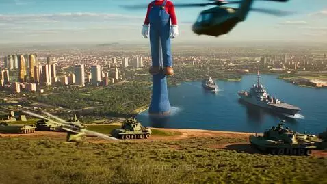 MiniMax Director Prompt: 150 kilo-meter Giant Mario, cinemactic, life, land, normal 800 feet long battleships while battleship are minature compare to Giant Mario, speck helicopters, Giant Mario can crush the every lands or such, 150 kilo-meter Giant Mario rampaging, Millatry use Giant Mario little speck 5.9ftbro Luigi to lure Giant Mario out of destruction and GiantMario spots Luigi and come after Luigi, Luigi runs away from 150-kilometer Giant Mario it's successful from militarty tatics; Luigi's big brother, 150-Kilometer Giant Mario is chasing 5.9ft Luigi