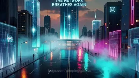 Wan 2.5 Preview Prompt: cyberpunk city skyline at dawn, glowing data streams flow through skyscrapers, digital mist rising from neon streets, the phrase “THE NETWORK BREATHES AGAIN” appears in holographic letters, slowly pulsing with white-blue light, ultra-detailed, cinematic lighting, lens flare, atmosphere of hope after the storm, volumetric light rays cutting through fog, photorealism, 2099 year, epic finale shot
