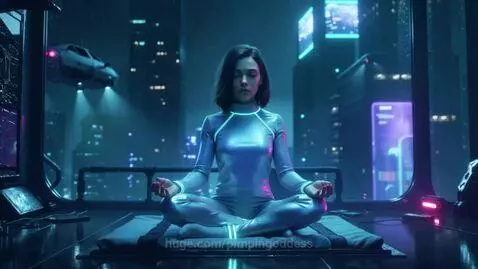 Kling 2.5 Turbo (pro) Prompt: Style: 2099 year. Cyberpunk cinematic short film, ultra-detailed, photorealistic, realistic lighting and materials, volumetric light and shadow, soft depth of field, HDR, 8K quality. Color palette: deep cyan, magenta, violet and cold neon tones with soft ambient haze. Atmosphere: moody, reflective, slightly melancholic but filled with inner strength. Textures: wet asphalt, glass reflections, flickering holograms, metallic surfaces, neon bokeh. Camera setup: Anamorphic lens, cinematic framing, shallow focus, low-angle or mid-shot depending on emotion, realistic motion blur, light flares and particle effects. Optional drone sweeps or slow panning for environmental shots. Lighting: Mixed neon and ambient backlight with secondary reflections. Use red or purple accent lights for emotional tension, blue or teal for calm introspection. Scene 59. young woman in home. Rest? Yes. But not in antiques. In the silence between pulses. In the moment when even drones slow their scans. That’s their ‘meditation’. Their way to remind themselves: ‘I am not just a tool.