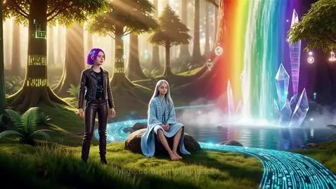 Wan 2.5 Preview Prompt: Photorealistic ultra-detailed cinematic Virtual Reality educational zone, vibrant saturated colors, forest with trees, sparkling streams of code-data, rainbow waterfall in center. Soft golden sunlight, volumetric god rays, particles. Camera: dynamic 8K, depth of field. Girl 1: 16-year-old teen, short vivid purple hair, slim athletic build, dark leather pants and jacket with subtle glowing circuits, cyber-implant at temple, confident expression. Girl 2: 13.5-year-old teen, long flowing silver hair, delicate face, light blue robe with unknown hieroglyph embroidery, barefoot, calm meditative eyes, sitting motionless on central rock unless specified. Lips move in sync with speech for speaking character only. Subtitles at bottom center, 1-2 lines, white text with black outline. Preserve consistent clothing throughout the video. Both girls silent, lips not moving. Girl 1 stops, looks at Girl 2 and says: “I’m the older student. Not your class? Help analyze waterfall code.” (lips sync with speech). Subtitles: “Waterfall analysis.”