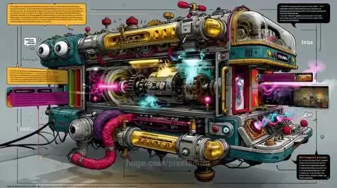 midjourney Prompt: An imaginative illustration of the Twist-o-Matic clean machine, a whimsical contraption filled with gears, levers, and glowing tubes. The machine features a fun and playful design, with text elements (like words and phrases) being inserted into one side through colorful input slots. Inside, the machine processes them with spinning cogs, flashing lights, and magical energy bursts. On the other side, vibrant images and reimagined prompts emerge, each in a unique and creative style. The scene is cheerful and vibrant, showcasing the limitless creativity of the machine.