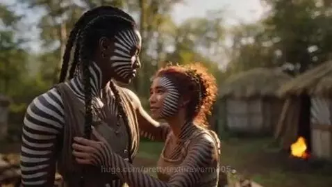 sora 2 Prompt: Tattooed Girls from the Zebra Tribe. The girls look wild but affectionate, with black and white zebra stripes covering most of their bodies. The scene takes place in the green forest of the camp, under the sun, with a soft light highlighting their tattoos and affectionate expressions. Each girl is unique, with unique tattoo details and poses that reflect their personalities.There's a sense of tension in the air, a mix of fear and "care," with tattoo tools (needles, ink bottles, and rags) scattered nearby. The background features wooden huts with striped patterns and a campfire in the distance. Zara (left, the leader): She's tall, muscular, and has tattoos covering her face (wide stripes from the forehead to the chin), neck, arms, and torso, resembling the thick black stripes of a wild zebra. Her hair is black, braided, and adorned with feathers. Zola (next to Zara, energetic): Average height, athletic, with narrow, wavy stripes on her arms and legs, like a running zebra. Her hair is red, messy, and covered with vines.