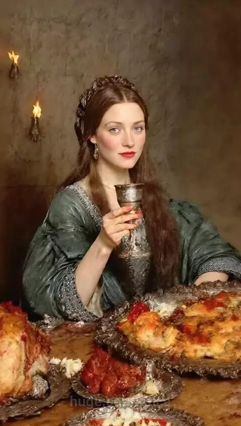 A dignified young aristocrat raises her goblet slightly in a toast and smiles discreetly.