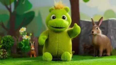 Плюшевый Горохострел, милый зелёный плюшевый персонаж, похожий на игрушечный pea-shooter, стоит в яркой уютной комнате, наполненной игрушками. Мягкое рассеянное освещение, тёплая цветовая палитра. Герой выглядит дружелюбным и любопытным, делает первый шаг навстречу приключениям. Стиль — мультяшный, детализированный, мягкие текстуры ткани, блестящие вышитые глаза. Атмосфера — добрая, позитивная, сказочная.