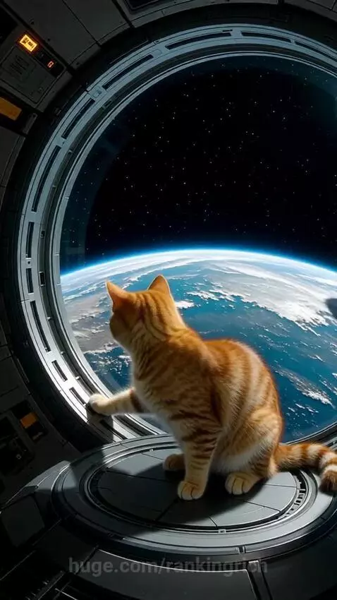A cat in a spaceship looking down on earth and seeing a asteroid hitting the Earth.